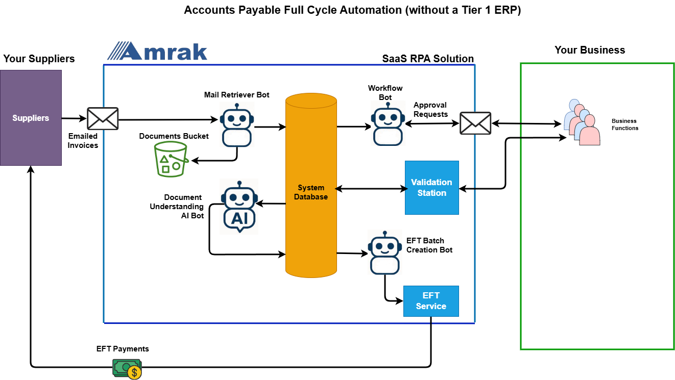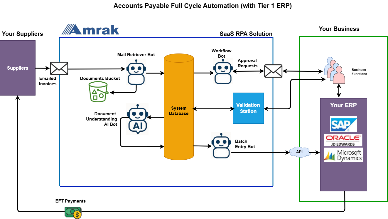 AI-Driven Data Processing: Using advanced machine learning and natural language processing, the system can extract, classify, and validate information from invoices, purchase orders, contracts, forms, and even handwritten notes. This removes the need for manual review.